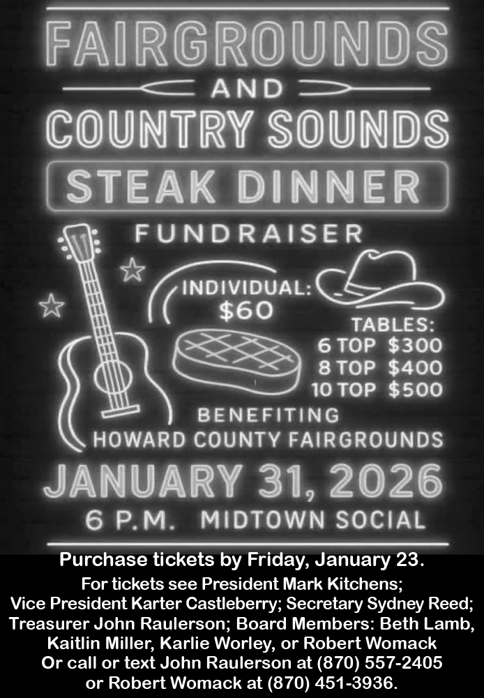 The cost of the fundraiser, which will include a steak dinner, will be $60 for individuals or tables from 6-top $300 to 10-top $500. Tickets should be purchased by Jan. 23 and are available from fair association members Mark Kitchens, Karter Castleberry, Sydney Reed, John Raulerson, Beth Lamb, Kaitlin Miller, Karlie Worley or Robert Womack.